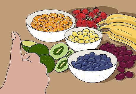 Focus on fresh fruits and vegetables. To keep your heart healthy when you have diabetes, try to "eat the rainbow" at every meal. Include many different colors of fruits and vegetables on your plate to create a heart-healthy meal almost automatically. Deeply colored fruits and vegetables are the best for your heart. Think of vegetables such as spinach and carrots, or fruits such as peaches and berries.Warning: While fruits and vegetables are important, stay away from fruit juices, which may have added sugars. Canned or frozen fruits and vegetables may also have added sugar or sodium, which you should avoid.