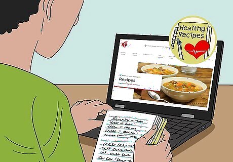 Assemble a collection of heart-healthy recipes. If you love to cook, you might find that the hardest part about your new diet is that you can no longer make the meals you've practiced to perfection. Fortunately, there are plenty of heart-healthy recipe books out there that you can experiment with. Many of these focus on heart-healthy variations on classic comfort foods. The American Heart Association has lots of heart-healthy recipes specifically for people with diabetes that you can download for free. Go to https://recipes.heart.org/en and browse the collections or search for your favorite ingredients.
