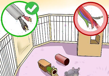 Construct a chinchilla-proof room. If you own a chinchilla and would like to let it out of its cage, you will have to have a room where it can’t harm itself. Remove all accessible wiring, and remember that chinchillas can jump as high as 6 feet (1.8 m)! Chinchillas love leaving their cages so if possible, let it out to explore once a day! Like all rodents, chinchillas like to gnaw, so remove all exposed wiring or place them in PVC piping, even wiring above cabinet-level. Make sure the room doesn’t have any holes or possible hiding places, like sofa beds or cracks in the walls. Be prepared to have any remaining furniture or objects be gnawed on, so don’t leave anything accessible that you don’t want ruined. Even in a chinchilla-proof room, always keep your eyes on your chinchilla so it doesn’t accidentally hurt itself.