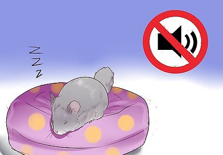 Pick an enclosed and quiet sleeping place for your chinchilla. Chinchillas are incredibly light sleepers so it needs to be kept away from daytime noise in order to maintain health. Find a place for your chinchilla cage that can allow for it to sleep when it needs to without being interrupted or woken. If you are struggling to find a space for your chinchilla, consider moving its cage into the living room at night and keeping it in a more secluded bedroom or bathroom during the day. Air conditioned garages or basements an also be good places for chinchillas during the day.