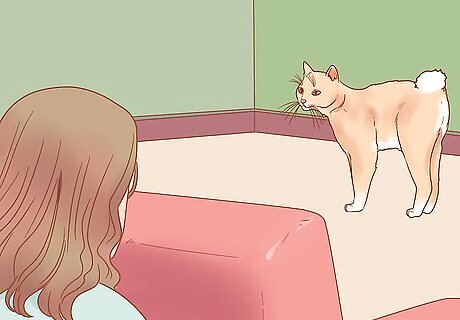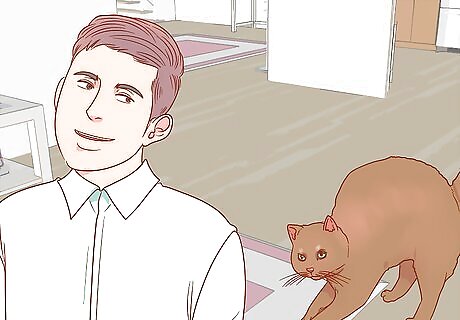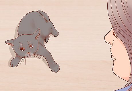 Introduce strangers slowly to shy cats. If your cat isn't fond of being out and about when friends come over, try working with a single person to help increase your cat's interest. Have the person sit still in a room. Encourage the cat to come into the room with a toy or treats and slowly move it toward the new person. If your cat gets upset, let it go back to the other room, though you can encourage it to come out again with treats or a toy. Repeat these sessions, and over time, your cat may become used to having strangers around and even approach one.