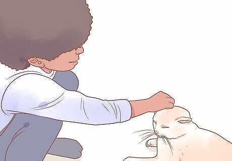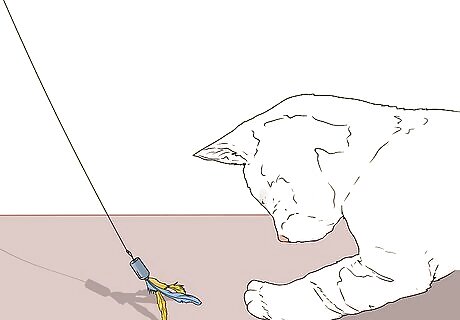 Encourage a shy cat to come out with play. Sit in the room with the shy cat and bring a fishing-type toy. Try to entice the cat out by moving the toy around, getting the cat's attention. It may want to come out and play. If it does, try not to make any sudden movements. Over time, the cat will begin to associate the fun time with you and may work up to hanging out with you more.