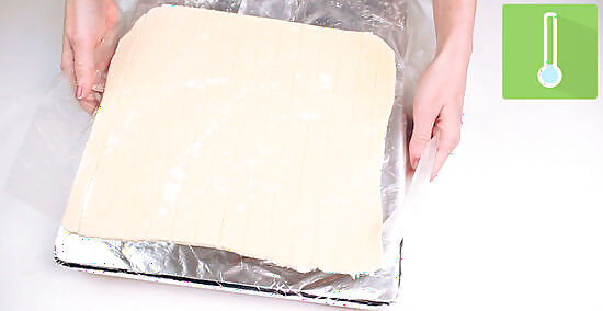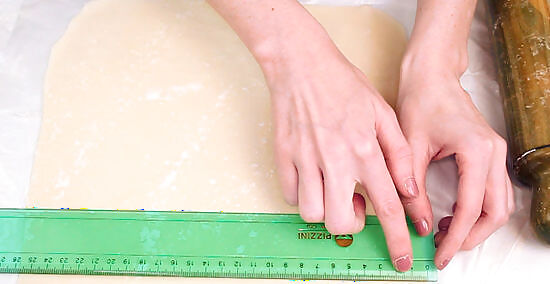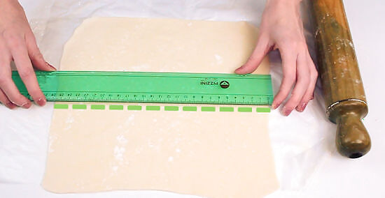 Realign the ruler with each slit. Repeat until your whole pastry dough is cut into ribbons.