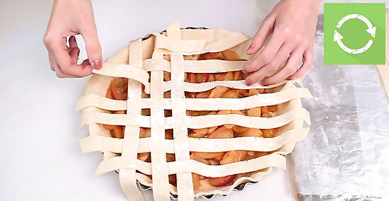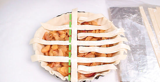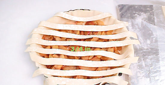 Remove the lattice strips from the refrigerator. Place them next to the filled pie.
