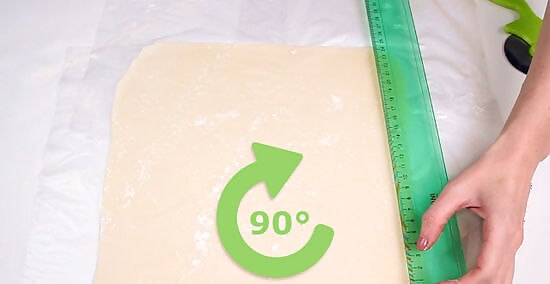 Turn the ruler 90 degrees. Align it with the first slit. Cut across the long side of the rectangle, across the edge of the ruler, with a pie cutter or pastry wheel. A fluted pastry wheel will make wavy ribbons for your lattice.
