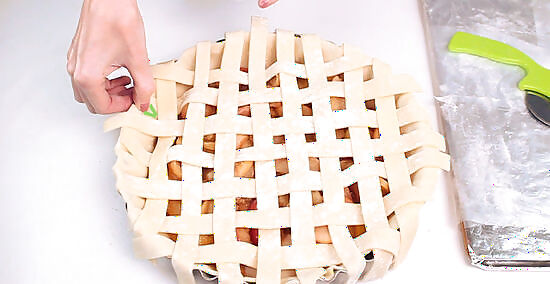 Pinch the point where the bottom crust meets the end of the lattice with your thumb and index finger. Press in a small “v” to make a crimped edge and repeat around the entire pie.