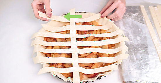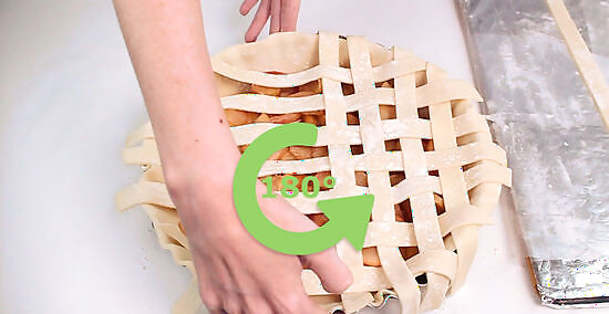 Turn the pie 180 degrees and repeat with the unwoven side. When you finish weaving your lattice, you should have strips of dough hanging over the edges around the entire pie.