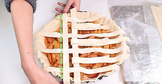 Work one side at a time. Fold back every other ribbon, until the ends of the dough meet on the left side. Grab a new pie ribbon and lay it vertically in the center of the pie.