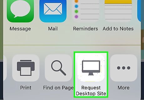 Swipe left across the bottom row of icons and tap Request Desktop Site. It's in the row that begins with "Add to Reading List." This refreshes the page as though you're looking at it on a computer web browser. Since the text and images on the page will appear smaller, you'll probably have to use the pinch and reverse-pinch gestures to zoom and out as you navigate the site.