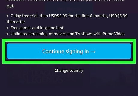 Tap the blue Continue signing in button. This will redirect you to Amazon, and prompt you to sign in with your Amazon Prime account. If you're prompted, select your country and press Continue.