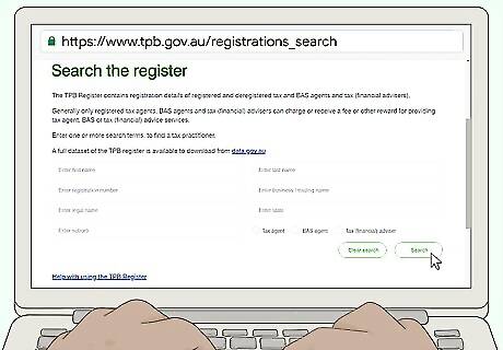 Find a registered tax agent near you. Any tax agent you use must be registered with the Tax Practitioners Board (TPB). Search the TPB's directory of registered agents at https://www.tpb.gov.au/registrations_search. You may want to compare 2 or 3 agents so you can find the one that best suits your needs and budget. Different agents may have different fee structures. Some may allow you to pay out of your refund, while others may want at least part of their fees upfront.