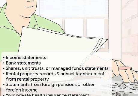Gather documents you'll need to complete your returns. Your financial records from the past income year have information you'll need to provide on your tax return forms. Specifically, you'll need to gather any of the following: Income statements or payment summaries Bank statements listing interest earned or fees you've paid Shares, unit trusts, or managed funds statements Rental property records and your annual tax statement from rental property Statements from foreign pensions or other foreign income Your private health insurance statement