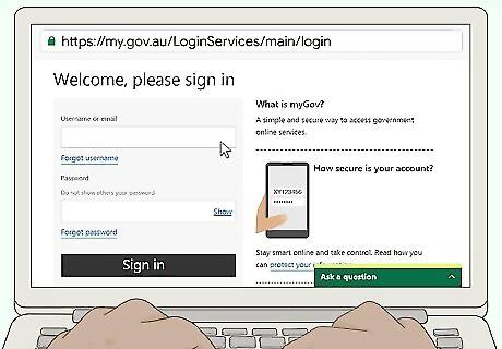Sign in or create an account on myGov. Go to https://my.gov.au/LoginServices/main/login and sign in with your username or email and password if you already have an account. If you don't, click the "Create an account" button below the sign-in button to get started. Read and click through the terms to create your account, then provide a valid email address. You'll get an email with a code you'll enter to verify your email address, then you can set up your account.