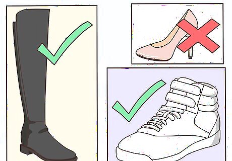 Stick to flats. Whether she's in sneakers, boots, or pumps, Eleanor tends to avoid heels. Depending on the time of day and the season, you can change it up. For example, try wearing a pair of all white sneakers like the Women's Freestyle Hi Lace-Up sneaker from Reebok for an everyday look. Then, in the colder months, try a pair of black, suede, over-the-knee boots similar to her Stuart Weitzman pair. You can also try out a sandal like her Shanna Gladiator ones in the summer.