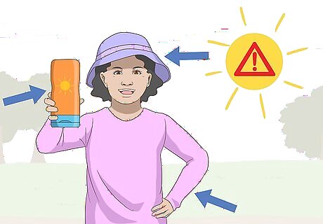Avoid exposure to intense sunlight. Sunburns cause lasting damage to the skin. Children who have had at least one blistering sunburn are at twice the risk of developing melanoma (a type of skin cancer) compared to children who never suffered blistering sunburns. Exposure to intense sunlight can be limited by covering up with long sleeves, pants, and hats and by wearing sunscreen. The Skin Cancer Foundation provides guidelines for minimizing exposure. Seek out shady areas and minimize your time in the sun when it is most intense – typically between 10AM and 4PM. Cover yourself with loose-fitting clothing, preferably made from fabric with Ultraviolet Protection Factor (UPF) rating. Wear a wide-brimmed hat and sunglasses that block ultraviolet (UV) light. Apply broad-spectrum sunscreen that is at least Sun Protection Factor (SPF) 30 when you will be out for an extended period of time. It is best to apply the sunscreen about 30 minutes before heading outside, and then to reapply sunscreen every two hours. Do not use tanning beds.