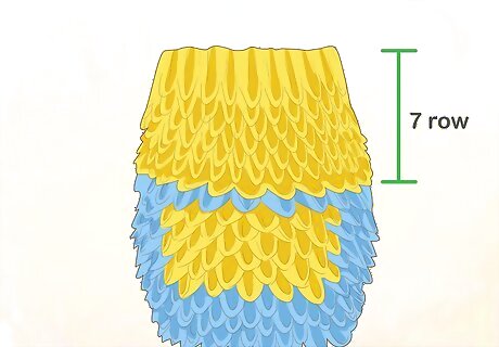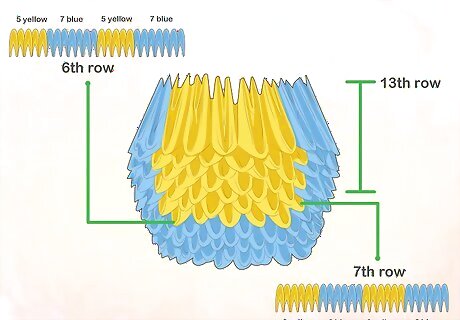 Use special color patterns on the 6th row and 7th row, through the 12th row. On the 6th row you need to put the pieces in this order: 5 yellow pieces, 7 blue pieces, 5 yellow pieces, 7 blue pieces. On the 7th row you need to put the pieces in this order: 6 yellow pieces, 6 blue pieces, 6 yellow pieces, 6 blue pieces. Continue like this until you have 7 rows that are made with yellow and blue pieces.