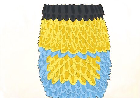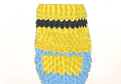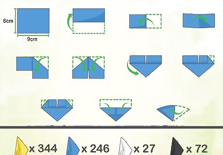 Make your origami pieces. In order to do this, you can read up on How to make 3D origami pieces, or you can follow this explanation: Take one of the squares and hold with the longer side on the bottom. Fold in half from the bottom to the top. Fold again from right to left but don't press the fold very hard. Unfold the last fold and rotate the paper. Fold the right side of the paper to the bottom line in the middle then do the same to the left side. This should now look like an house. Turn over. Fold down outside corners. Fold the top 2 flaps down. You'll end up with a triangle. Fold in half and you are done. Make sure you have enough pieces for the model. You'll need: around 27 white pieces (made from rectangles of paper with dimensions of 2.5 cm x 5 cm) around 344 yellow pieces (made from rectangles of paper with dimensions of 6 cm x 9 cm) around 72 black pieces (made from rectangles of paper with dimensions of 6 cm x 9 cm ) around 246 blue pieces (made from rectangles of paper with dimensions of 6 cm x 9 cm).