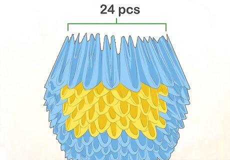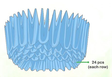 Make an origami base. After you finished to make the pieces, start assembling the base. For this you will need 48 pieces. You will notice that each piece will have two legs and two pockets. To assemble them you will put the leg of one into the pocket of another, but you must make sure to keep them alternating like bricks so that each new piece you put on is resting on two different pieces. So to put it another way, grab one piece and take the right leg and insert it into the left pocket of another piece. With the left leg of the first piece, place it inside the right pocket of a third piece. Continue adding pieces on top then on bottom until you have used all 48 pieces in: 24 on the top row and 24 on the bottom row. Now that you have this line you must connect the two ends together so that you now have a ring.