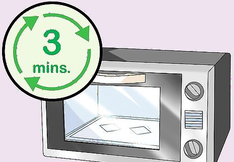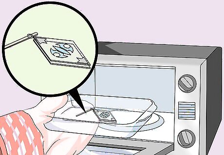 Carefully place the cookie sheet inside the oven and allow the pieces to bake for 3 minutes. As they bake, they will shrink (they are Shrinky Dinks after all) as well as become nine times thicker. It is important to watch them during this process as they run the danger of curling up and sticking to themselves, thus preventing them from flattening out properly. Grab a chair and sit where you can see the pieces as they draw up, and keep the pair of wooden skewers or chopsticks on hand to reach into the oven and pull the pieces apart if they start curling into themselves. (Children should have an adult do this.) Once the 3 minutes have passed, take the cookie sheet out of the oven and lay it on a heat-safe surface (or potholders) and allow the pieces to cool. Then, turn the oven temperature up to 450ºF (230ºC) and allow it to heat up. While you're waiting, work on the next step.