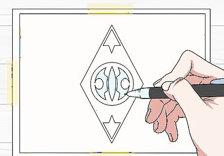 Color in the attribute symbol in the center of the pattern with the Painters paint marker. Try to only fill in the space inside the lines; when the plastic is baked later, the painted areas will puff out slightly and fill out the design more. Allow the paint to dry before continuing on to the next step. If the marker is new, or isn't painting well, you will need to prime it; shake the marker up and down for a couple of minutes (you should eventually hear the agitator sliding back and forth inside the marker), then press the marker tip down onto a scrap piece of thick paper or cardboard so that the tip retracts into the marker. Paint will start to flow into the spongy tip. It will easily make a mess, so be careful when doing this step!
