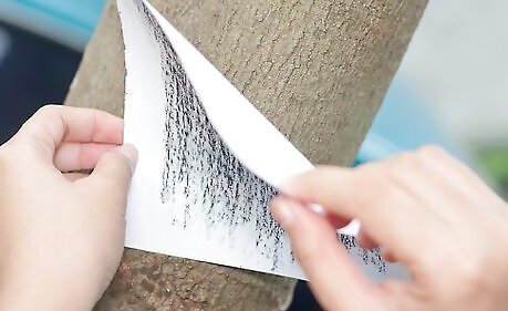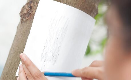 Take out your white sheet of paper and press it against the bark of the tree.