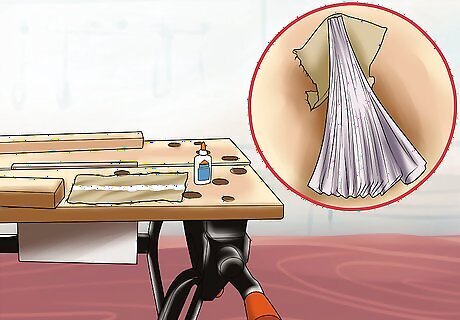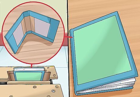 Bind the book. If you have multiple sections, place them in the correct order. Align all of the edges. Using a Workmate, secure the book tightly between two pieces of wood. The sewn edges of the book, the side with the loose strings, should be facing up. Measure and cut a piece of scrap fabric. The fabric must be 2 inches longer than the book’s spine. When placed on the spine, there should be 2 to 4 inches of fabric on each side, or wing of the book. Use a brush to apply a coat of binding glue to the sewn edges of the book and adhere the piece of fabric to the spine. Allow the glue to dry before removing the bound book.