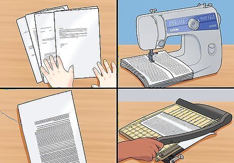 Fold, sew, and trim the book at home. Individually fold each page down the center. If you printed more than one section of pages, keep the pages separated by section. Restack the papers in the correct order. Using a sewing machine, sew a straight line down the center fold of each section of papers. Begin sewing 1 to 2 inches away from the paper’s top edge; finish sewing 1 to 2 inches away from the paper’s bottom edge. Don’t trim the loose thread, but leave 3 to 4 inches of loose thread on each end. With a needle, Pull the loose threads to the outside of the book. Repeat this process on each section of papers. Once all batches are sewn, pull all of the loose thread from the inside of the book to the outside of the book with a needle. Trim off any excess paper with a paper cutter.