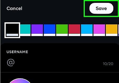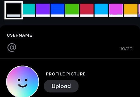 Edit your profile as you'd like. You can change the color of your profile by tapping a color swatch along the top of your screen. Swipe through that color menu to see more colors. Tap in the username field if you want to change your username. Tap Upload to upload an image for your profile picture. Tap in the display name field if you want to change your display name. This is the name people will see when you comment or create videos. Tap in the about field to add a bio, if you want to.
