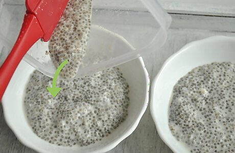 Distribute the mixture between two bowls. Take the bowl out of the fridge. Give it another stir. Ladle the chia seed mixture into two bowls. Use a rubber spatula to scrape the bowl clean so that you don't waste anything.