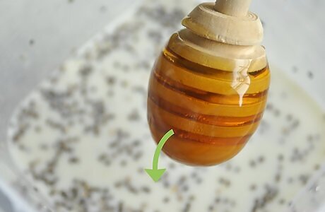 Combine the chia seeds, milk, and yogurt in a large bowl. Use a rubber spatula to stir everything together. Scrape the bottom and sides of the bowl often so that everything gets evenly mixed. Almond milk is recommended for this recipe, but you can use a different type of milk as well. You can use any type of yogurt you like. Flavored yogurt is recommended, but you can use plain if you prefer.