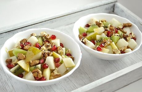 Top it off with some sliced fruit and nuts, if desired. Wash, peel, and slice your favorite fruit, then layer it on top of the bowl in even stripes. Try using a combination of different fruits for a more colorful (and tasty) bowl. Add a handful of nuts, seeds, or granola to one side of the bowl. Leave smaller fruits, such as blackberries, raspberries, and blueberries whole. How much fruit you use is up to you! Some people like to cover the entire surface of the bowl with fruit, while others like to use only a few slices.
