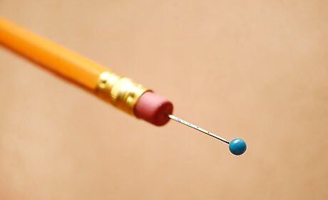 Upgrade the simple pin. While you could just use the head of the straight pin to make small dots on your nails, joining the pin to a pencil with an eraser end will provide you with better leverage and balance. Insert straight pin into the pencil eraser head. You may need to put a little bit of muscle into this action in the event that the pin doesn’t easily penetrate the eraser. Hold the pin on a flat surface, sharp side upward. Hold the pin at the bottom to so you can join the pencil eraser with the pin. Grasp the pencil in your other hand (while holding the pin on the flat surface), eraser side downward, and press the eraser into the sharp side of the pin. Drive the eraser into the pin until at least half of the pin has punctured the eraser.