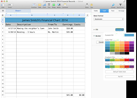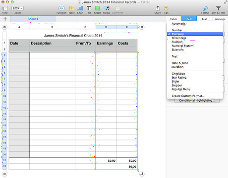 Format the earnings or expenses columns. Select all the cells for money data. Go to the Cell tab. Select the Currency setting. Change the settings to your currency type or preferences.
