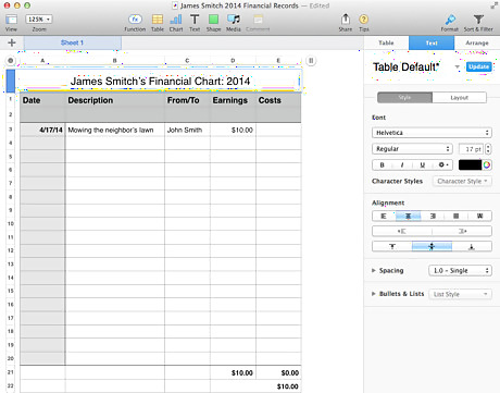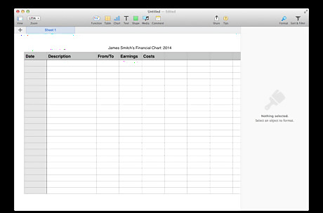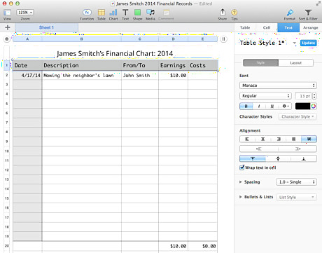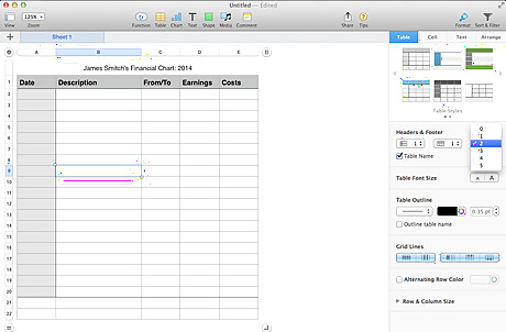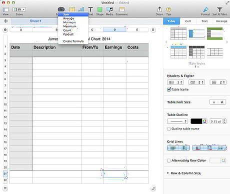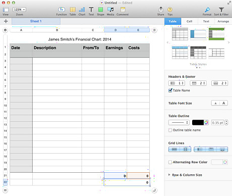 Start adding information to the header column cells. Don't forget the date, description, from/to, earnings, and costs. The date column should be the column farthest to the left. You may need to adjust the columns' widths as you add information. Find the letter (A, B, etc.) for the column you want to widen or shrink. Select that letter's box and drag the edge the desired direction. To sub-divide a column (like the earnings or costs one) you'll need to add another header row. Click on any cell, go to the Table tab on the right, find the header options drop-down, and add another header row. Add a column directly before or after one of the sub-divided columns. Select the new header column cell and the one with the text and merge them.