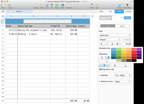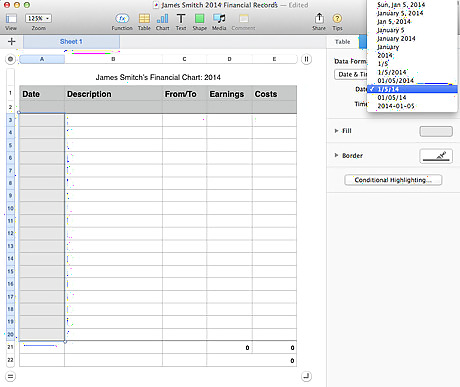 Format the date column. This lets you enter a date however you like (for example, either April 17, 2014 or 4/17/14) and then re-formats the date to the specified format. Select all the date cells. Go to the Cell tab and select Date & Time for the data format. Set the date and time formats according to your preference.