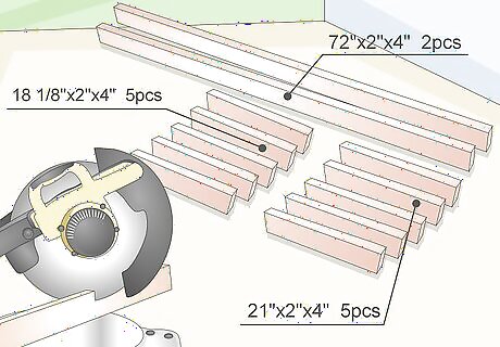 Cut your pieces using a circular saw. You will need five 21-inch (53.34-centimeter) long boards for the support joists. You will also need two 72-inch (182.88-centimeter) long boards for the front and back aprons. Lastly, you will need five 18⅛-inch (46.038-centimeter) long boards for the back supports Each board needs to be 4 inches (10.16 centimeters) wide and 2 inches (5.08 centimeters) thick.