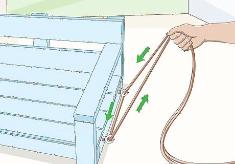Feed the rope through both hooks and tie. Cut two long pieces of study rope. Feed your first rope through both hooks on the left side. Feed your second rope through both hooks on the right side. Tie the ends together into a sturdy knot on each side. The rope needs to have a 200-pound (90.72-kilo) weight capacity.