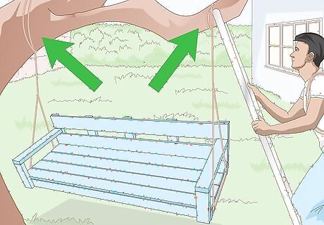 Attach the swing to a sturdy branch or rafter. Make sure that whatever you are hanging the swing from can support the weight. If you are hanging the swing from a set of rafters, use eye screws or heavy duty swing hangers. If the swing is still too tippy after you hang it, add one more set of eye bolts and ropes to the backrest. For more comfort, hang it at a slight backward angle, about five degrees.