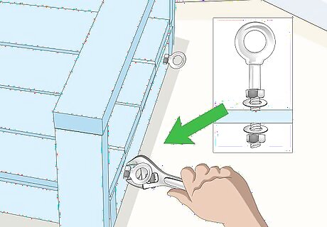 Attach eye bolts to sides of support jousts, right between the arm front and back rest. Drill the hole first, all the way through the joust. Place a washer over the hole, then a nut. Twist in the eye bolt, all the way through the board. Place another washer over the end of the bolt on the other side of the beam. Lastly, twist on the nut. Make sure that the looped part of the bolt is oriented vertically. When you look at the swing straight on from the front, it should be shaped like a "O".