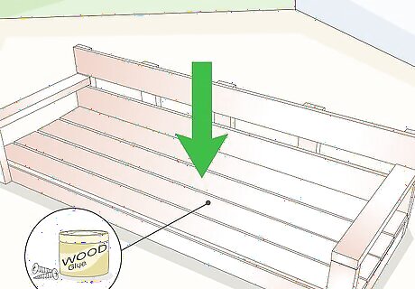 Add the seat slats. Attach the remaining four slats to the support joists. Leave ½-inch (1.27-centimeter) gaps between them. The first slat should be flush to the arm fronts. The back slat should be flush to the back supports. Use 2-inch (5.08-centimeter) finish nails and wood glue.