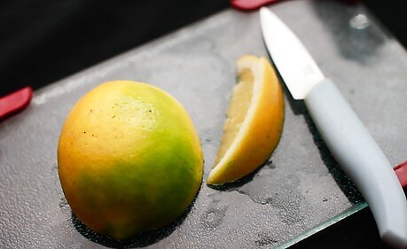 Cut a lime in half. Place one half on the side and cut the other half into a wedge.