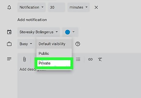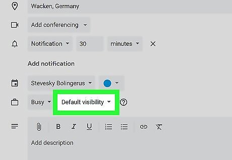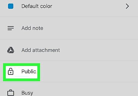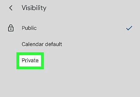Tap Visibility next to the icon of a padlock. You might also see Calendar default or Public. Tapping this opens the privacy settings.