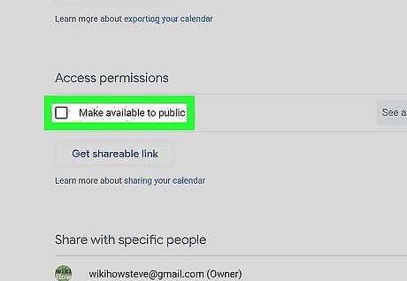 Click to unmark the box next to "Make available to public." This turns off any link sharing you've enabled with this calendar. If you have specific people that you're sharing your calendar with and want to remove them, click the X next to their name.