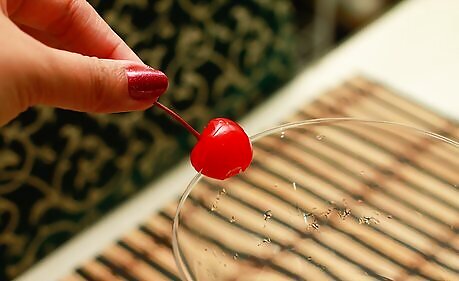 Cut a slit on the bottom of the strawberry and wedge it onto the side of your glass.