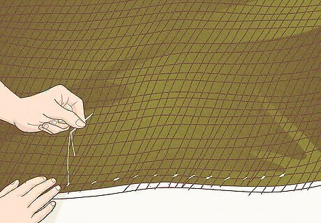 Attach your netting onto the back of your BDUs using a combination of the following; unwaxed dental floss (high tensile strength and because if no wax, it holds a knot a LOT better and does not rot like thread will over time) and ShoeGoo. You can either attach the netting with just ShoeGoo, or you can use dental floss like you would use a needle and thread and then, ShoeGoo on top/over the knots you've made w/the dental floss. Anchor the netting onto the seams of your BDUs with unwaxed dental floss every 3 inches (7.6 cm) or so, adding additional stitches in areas of high stress such as the shoulders. (keep in mind, this takes a few hours to do it right. Ideally you don't want the netting to pull up any more than an inch to 1 ⁄2 inches (3.8 cm) off your back or you will deal with a 'sagging' effect.