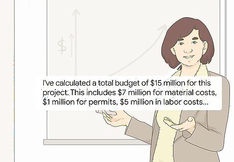 Explain your process for developing the budget and timeline. Sponsors and managers will want to know how you came up with your estimates. Be ready to briefly explain your procedure. While explaining, name any potential variables or risks that could impact these projections, and how the project might account for them. You don’t have to go through every calculation you made. Start by presenting the estimate for each milestone, and give a summary of how you reached that conclusion. If anyone wants more information, be prepared to go into more detail. Be concise and direct when explaining the budget. For example, state, "I've calculated a total budget of $15 million for this project. This includes $7 million for material costs, $1 million for permits, $5 million in labor costs, and $2 million in land purchases. I developed these estimates by researching the normal expenses for construction in this area last year. I'm happy to explain these calculations further if anyone wants more detail."