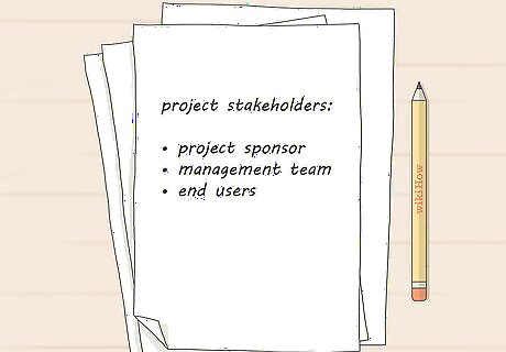 Identify all the necessary project stakeholders. A stakeholder is anyone who will be affected by the project. This is a long list of people ranging from the project sponsor down to the individual employees who will work on the project. There are a few stakeholders you should identify and communicate with throughout the process. The project sponsor is the person or business that provides the funds for the project. They usually own the end result. Usually the sponsor has to sign off on all big decisions. The management team are the ones who oversee the project. Usually each member of the management team heads a division that carries out specific tasks to complete the project. End users are people who will use the project when it's finished. Visitors to a building, for example, are end users. You usually don’t meet with end users, but you should take their potential concerns into account while planning the project.