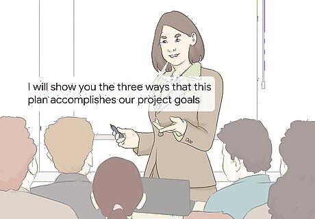 Demonstrate how the plan addresses your sponsor’s expectations. The main person or people you have to impress with the project plan is the sponsor. If they like your plan, they’ll go ahead with the project. If not, they could end up pulling out and you could lose a lot of money. Begin by addressing how this plan accomplishes the project scope. Use clear, simple language when explaining your plan. Avoid jargon as much as you can so there are no miscommunications and everyone is on the same page. Clear statements like, "I will show you the three ways that this plan accomplishes our project goals," convey your message best. There are many options that can help you formulate your project plan and present it in a visually attractive way, helping with comprehension. For instance, you could present it like a Gantt chart to help stakeholders have a complete vision of the project.