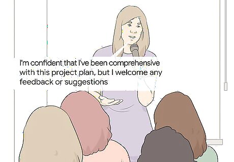 Ask for feedback and revisions. Revising the project plan is a normal part of the process. It’s likely that at least one stakeholder will have suggested changes to the project plan. Ask the team for feedback or criticisms. If someone suggests a change, bring it up with the whole team. If they agree, make the revision to the plan. Stating, "I'm confident that I've been comprehensive with this project plan, but I welcome any feedback or suggestions," shows that you're happy with the plan you produced but are flexible enough to work with a team as well. Take concerns from project managers seriously. They are the ones who have to carry the project out, and if they think one of your estimates is unrealistic you should consider revising it.