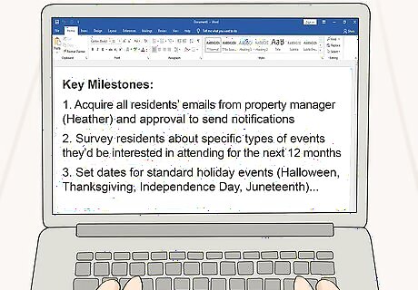 Divide the project into key milestones. Once you’ve defined the scope, you can identify the milestones the team has to meet. Milestones are large tasks that progress chronologically. When one milestone is met, another begins. This will help keep your team on track. If the goal is building an apartment building, important milestones would include purchasing the land, getting the building permits, laying the building foundation, constructing the frame, and so on until the building is completed. Identify all necessary milestones like these. List the milestones in the order they have to be done. For example, you can’t lay the foundation until you have construction permits. Keep your project flow organized like this.